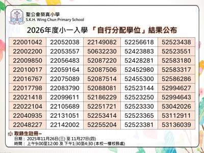 2026年度小一入學「自行分配學位」結果公佈